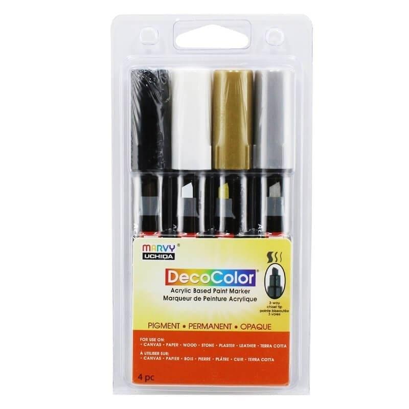 Markery akrylowe ""Marvy DecoColor(R)"" nadają się do pisania i malowania na dowolnej powierzchni: papierze, kartonie, szkle, kamieniu, betonie, metalu, plastiku, gipsie, terakoty, styropianu, drewnie i innych powierzchniach. Doskonale sprawdza się również w projektach szkolnych, może służyć do ozdabiania obiektów zewnętrznych (doniczek, ławek itp.) oraz innych kreatywnych dzieł sztuki lub designu. Ważne jest, aby wiedzieć: Przed użyciem sprawdź kompatybilność powierzchni. Te akrylowe markery mają trójstronną końcówkę w kształcie dłuta, która umożliwia rysowanie w różnych kierunkach. Farby do markerów nie zawierają kwasu, nietoksyczne i długo utrzymują po wyschnięciu. Nadaje się zarówno dla profesjonalistów, jak i amatorów.