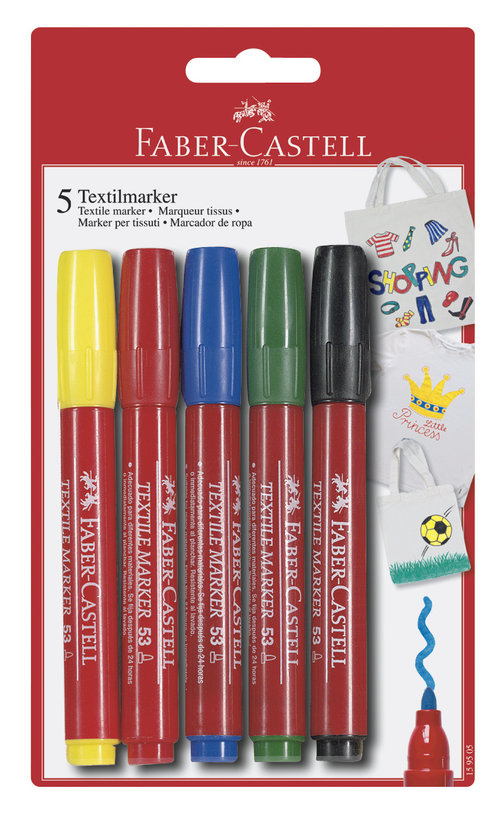 • możliwość stosowania na różnego rodzaju tkaninach • w celu zachowania kolorów pozostawić do wyschnięcia przez 24 godziny lub utrwalić niezwłocznie poprzez zaprasowanie rysunku po przeciwnej stronie materiału żelazkiem rozgrzanym do temp. 60°C • dostępne kolory: żółty, czerwony, zielony, niebieski, czarny • materiał wyprać przed zastosowaniem • opakowanie blistrowe 5 szt.