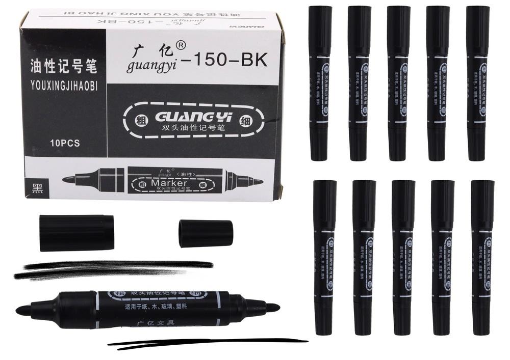 Zestaw Markerów Dwustronnych Wodoodporny Czarny 10szt. Zestaw markerów dwustronnych to narzędzie dla każdego. Każdy marker wyposażony jest w szybkoschnący tusz, który jest wodoodporny, a także odporny na rozmazywanie i blaknięcie, co zapewnia długotrwałe efekty i doskonałą jakość rysunków. Umożliwiają rysowanie bardzo szerokich lub cienkich, dobrze widocznych linii na różnorodnych powierzchniach, takich jak tekstura falista, drewno, metal, folia, kamień, plastik. Dzięki temu zestawowi możesz zrealizować swoje kreatywne pomysły na niemal każdej powierzchni. Każdy marker oferuje 2 końcówki o różnym rozmiarze - jedną szeroką do tworzenia grubszych linii i drugą cienką do precyzyjnego rysowania detali. W skład zestawu wchodzi 10 czarnych markerów, które zapewnią ci wszechstronność w pracy artystycznej i pozwolą na wyrażenie swojej kreatywności w różnorodny sposób. Wymiary opakowania: 14,5cm x 10,5cm x 4cm Posiada certyfikat CE.