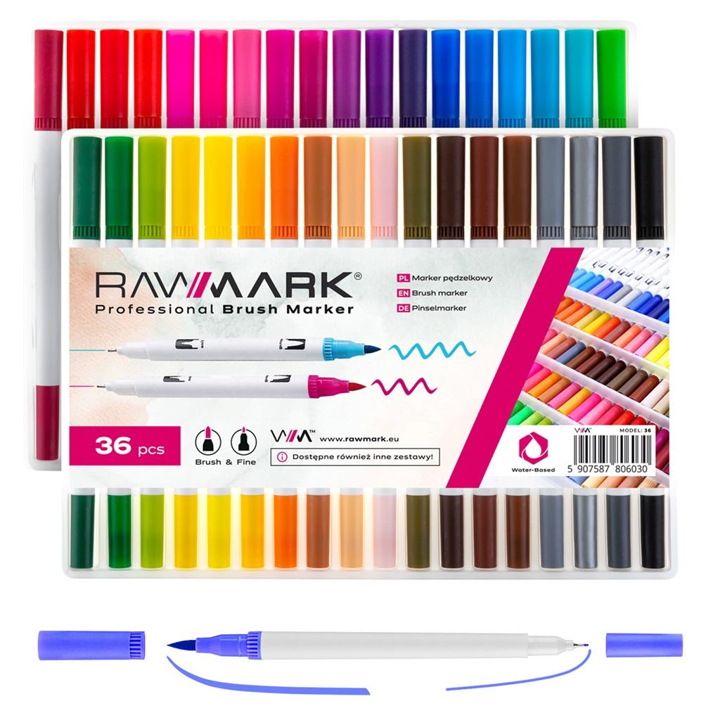 Markery dwustronne, pędzelkowe RAWMARK 36 kolorów Dwustronne profesjonalne markery z końcówką pędzelkową, które pozwolą Ci wylać swoją wyobraźnię i kreatywność na papier. Zestaw zawiera 36 markerów z dwiema końcówkami: - marker (pędzelkowy) 1-6 mm - cienkopis 0.4 mm Zestaw doskonale nadaje się do pisania i kolorowania. Dla początkujących i zaawansowanych. WODNY EKOLOGICZNY TUSZ Bezwonny, bezkwasowy i nietoksyczny tusz na bazie wody sprawia, że markery nadają się do każdego rodzaju pracy z nimi. Do szkoły Na zajęcia artystyczne Do pisania Do pracy biurowej Dzięki specjalnemu tuszowi napisy i rysunki na kartce nie rozmazują się. Dzięki zastosowaniu tuszu na bazie wody możesz malować markerami na każdym papierze! Nie będzie konieczne korzystanie ze specjalnego papieru przeznaczonego do markerów, tak jak w przypadku markerów alkoholowych (RawMark PurePro). S P E C Y F I K A C J A - dwie końcówki - szczelne skuwki - nie rozmazują się na papierze - bezwonne - uniwersalne