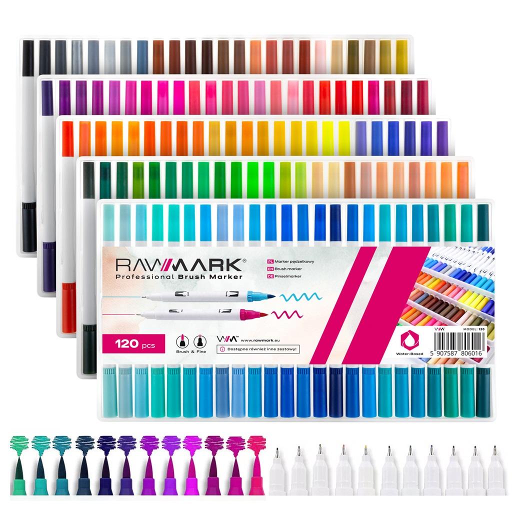 Markery dwustronne, pędzelkowe RAWMARK 120 kolorów Dwustronne profesjonalne markery z końcówką pędzelkową, które pozwolą Ci wylać swoją wyobraźnię i kreatywność na papier. Zestaw zawiera 120 markerów z dwiema końcówkami: - marker (pędzelkowy) 1-6 mm - cienkopis 0.4 mm Zestaw doskonale nadaje się do pisania i kolorowania. Dla początkujących i zaawansowanych. WODNY EKOLOGICZNY TUSZ Bezwonny, bezkwasowy i nietoksyczny tusz na bazie wody sprawia, że markery nadają się do każdego rodzaju pracy z nimi. Do szkoły Na zajęcia artystyczne Do pisania Do pracy biurowej Dzięki specjalnemu tuszowi napisy i rysunki na kartce nie rozmazują się. Dzięki zastosowaniu tuszu na bazie wody możesz malować markerami na każdym papierze! Nie będzie konieczne korzystanie ze specjalnego papieru przeznaczonego do markerów, tak jak w przypadku markerów alkoholowych (RawMark PurePro). S P E C Y F I K A C J A - dwie końcówki - szczelne skuwki - nie rozmazują się na papierze - bezwonne - uniwersalne