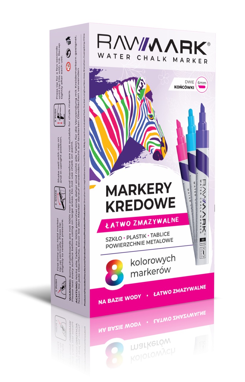 KREDOWE MARKERY do tablic / szkła Ilość: 8 kolorów Marka: RAWMARK Dwustronna końcówka Ekologiczny tusz na bazie wody Markery pomagają rozwijać wyobraźnię! Nie musisz chodzić i pilnować młodych rozrabiaków, ponieważ kiedy popiszą po lustrze, czy szybie - po prostu zetrzesz tusz wilgotną ściereczką. Stwórz dekorację Niezapomniane wrażenia możesz dostarczyć każdemu z kręgu twoich znajomych. Dzięki tym markerom możesz na lustrze w łazience napisać "Pamiętaj, że Cię kocham!" - dzięki temu sprawisz, że się uśmiechnie. W łazience, w kuchni, na oknie, na tablicy - tylko TY dyktujesz granicę.. Jeżeli stworzysz grafiki w oknach lub lustrach - możesz zrobić sobie, rodzinie, lub przechodniom "DZIEŃ DOBRY !!!" Zmazywalny z powierzchni nieporowatych: - tablice kredowe (czarne, zielone etc.) - tablice suchościeralne (whiteboard) - tablice szklane - szkło (także lustra) - plastik (również folia) - metal - winyl (także PVC) Trudno zmazywalny na powierzchniach porowatych: - karton - papier - drewno Markery kredowe w 8 najbardziej potrzebnych kolorach: - CZERWONY - BIAŁY - POMARAŃCZOWY - ŻÓŁTY - ZIELONY - FIOLETOWY - NIEBIESKI - RÓŻOWY UWAGA! Markery posiadają dodatkowe zabezpieczenie, przez co przed pierwszym użyciem musisz potrząsnąć i przycisnąć do kartki końcówkę. Dzięki temu tusz spłynie, a Ty możesz cieszyć się nowym RAWMARKIEM.