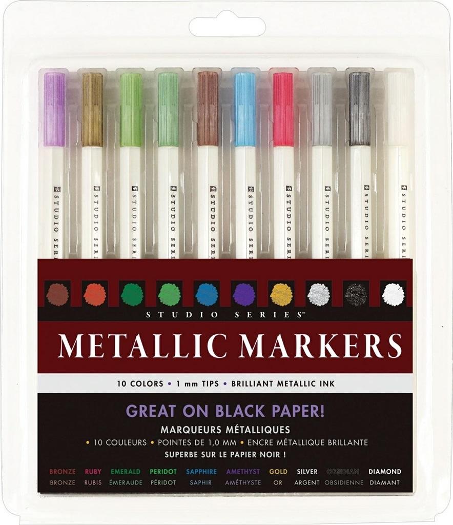 "Markery metaliczne firmy Peter Pauper Press. Zestaw markerów metalicznych w 10 kolorach pozwoli nadać prawdziwego blasku pracom artystycznym, ręcznie robionym kartkom, ułatwi podpisywanie zdjęć. Kolory będą widoczne nawet na czarnym papierze. Grubość pisania to 1 mm. Długość jednego markera to 16,5 cm. Całość zamykana w praktyczne pudełko o wymiarach 13,5 x 20,32 cm.