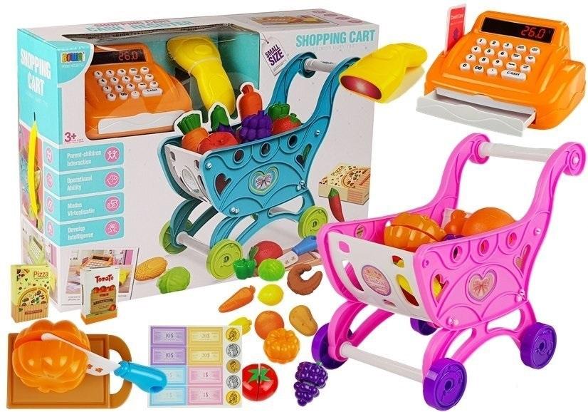 Market Wózek Sklepowy Kasa Fiskalna Akcesoria Zabawa w sklep jest jedną z najpopularniejszych rozrywek dzieci w różnym wieku. Taka forma spędzania czasu pozwala na naukę liczenia i negocjacji. Zabawkowa kasa fiskalna to ciekawa propozycja na rozwijanie w dziecku chęci do nauki podstaw matematyki w bardzo przyjemny sposób. Kasa sklepowa z wózkiem i akcesoriami będzie doskonałym uzupełnieniem umożliwiającym jeszcze ciekawszą i lepszą zabawę, a także kolorowym i przyjemnym akcentem w wystroju pokoju dziecięcego, czy sali zabaw. Przedstawiony model jest bezpieczną zabawką, ponieważ do produkcji zabawkowej kasy sklepowej użyto materiałów najwyższej jakości posiadających wszelkie wymagane certyfikaty. Design zabawki jest bardzo nowoczesny. Opływowy kształt kasy doskonale współgra z jej intensywnym kolorem, przez co na pewno przyciągnie wzrok dziecka, zachęcając tym do zabawy. Wysuwana szuflada, oraz atrapy : skaner produktów i wyświetlacz to tylko jedne z wielu zalet tego sprzętu. Wraz z zabawką młoda kasjerka bądź kasjer otrzymają: - wózek Sklepowy - akcesoria spożywcze: pomidor, marchewka, cytryna, pomarańczą, kukurydza, rogal, kapusta, dynia - atrapa czytnika produktów, - kasa fiskalna, deska do krojenia, nóż -kartonowe monety i banknoty. Szereg różnorodnych akcesoriów umożliwi dziecku stworzenie własnego sklepu z szerokim asortymentem, co pozwoli mu na rozwijanie wyobraźni i dokładne wcielenie się w rolę kasjera. Zestaw młodego sprzedawcy zapakowany jest w ozdobne, barwne pudełko, dzięki czemu doskonale nadaje się na prezent. By uruchomić kasę fiskalną należy użyć trzech baterii AA, które nie są dołączone do zestawu. Wymiary elementów wchodzących w skład zestawu dla kasjera: - kasa fiskalna: 14 cm x 11 cm x 7cm - wózek sklepowy: około 28 cm x 24.5 cm x 18 cm Wymiary opakowania: 40 cm x 28 cm x 12 cm