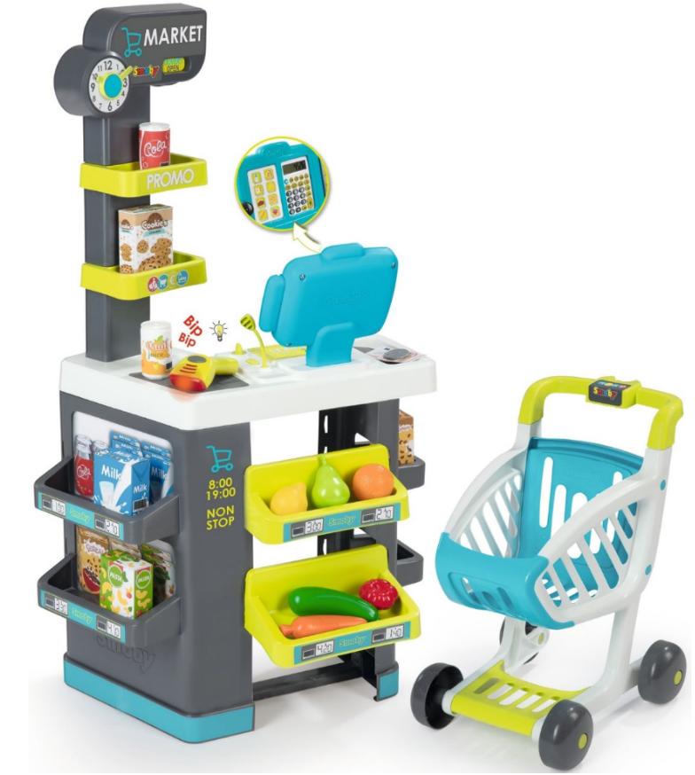 Smoby market, stworzony przez znaną i cenioną firmę Smoby, to wspaniały, ogromny zestaw dla dzieci do zabawy w sklep. Utrzymany jest on w uniwersalnej, grafitowo-zielono-niebieskiej kolorystyce, dzięki czemu spodoba się zarówno chłopcom, jak i dziewczynkom.
