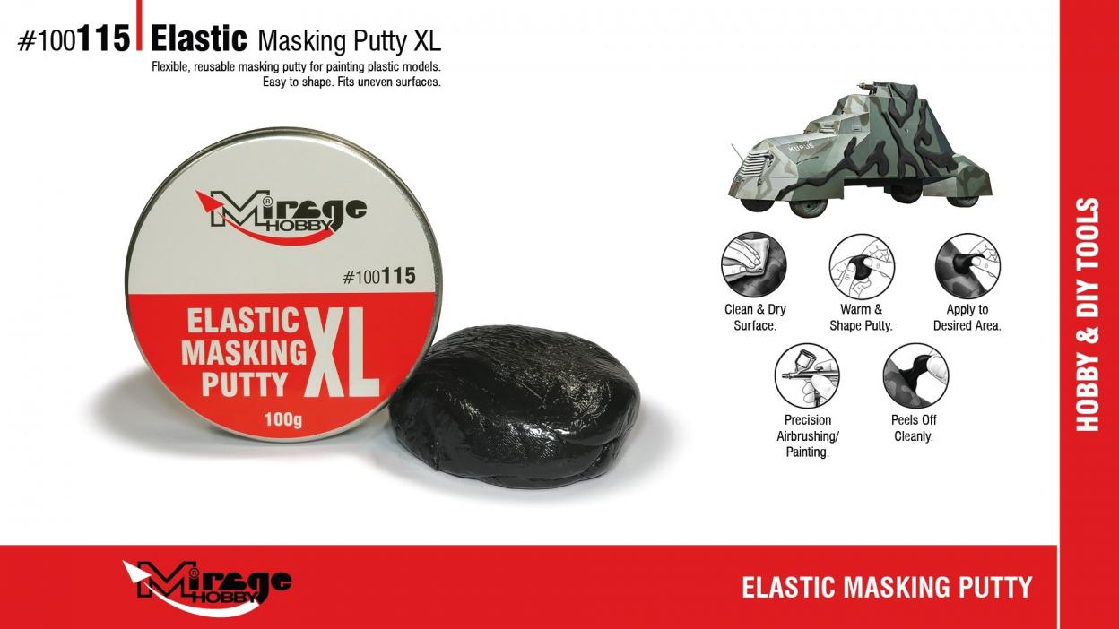 Elastic Masking Putty - elastyczna masa maskująca do modeli Masa Elastic Masking Putty od Mirage Hobby to elastyczna, wielokrotnego użytku masa maskująca przeznaczona do precyzyjnego malowania modeli plastikowych. Idealna do wykonywania miękkich przejść kolorów, kamuflaży oraz zabezpieczania nieregularnych powierzchni podczas malowania aerografem i pędzlem. Najważniejsze cechy: Elastyczna i łatwa w formowaniu - po ogrzaniu w dłoniach idealnie dopasowuje się do kształtu modelu Nie pozostawia śladów - po usunięciu nie zostawia kleju ani tłustych osadów Wielokrotnego użytku - można ją używać wielokrotnie bez utraty właściwości Idealna do miękkich krawędzi - doskonała do kamuflaży typu WWII, nowoczesnych wzorów i freehand Bezpieczna dla farb akrylowych, emalii i lakierów Jak używać: Upewnij się, że powierzchnia modelu jest czysta i sucha Ogrzej masę w palcach i uformuj w pożądany kształt Nałóż na model w miejscu maskowania Wykonaj malowanie (aerograf / pędzel) Po wyschnięciu farby delikatnie usuń masę. Masa Elastic Masking Putty od Mirage Hobby występuje w dwóch rozmiarach - 60g oraz XL 100g.