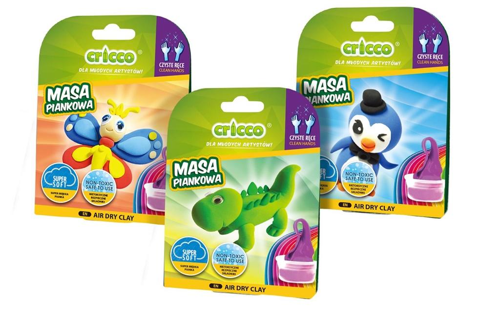 Super lekka masa piankowa CRICCO - ciastolina w kolorowym opakowaniu z instrukcją tworzenia gotowych wzorów (motylek, dinozaur, pingwinek). W prosty sposób można mieszać ze sobą różne kolory pianek, co pozwala na uzyskanie nowych kolorów lub odcieni. Miękką piankę można uformować w kulkę, która dzięki zastosowanemu materiałowi odbija się jak piłeczka. Po wyschnięciu masa jest nieodkształcalna i pozostaje w formie w jakiej zasycha. Przy wybranych wzorach znajdują się akcesoria dekoracyjne. Waga netto: 30g