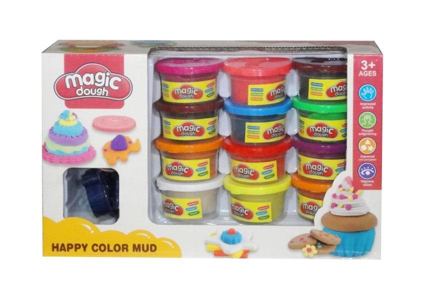 Zestaw masy plastycznej. W skład zestawu wchodzi 12 kubeczków z masą (12 różnych kolorów) wraz z akcesoriami do wyciskania niezwykłych kształtów. Po zakończonej zabawie, ciastolinę należy chować do kubeczków, aby uniknąć jej wyschnięcia (a dalej kruszenia). Zabawka przeznaczona dla dzieci powyżej 3 lat. Produkt zapakowany w kartonowe opakowanie z przezroczystym okienkiem. Podane wymiary są wymiarami opakowania.
