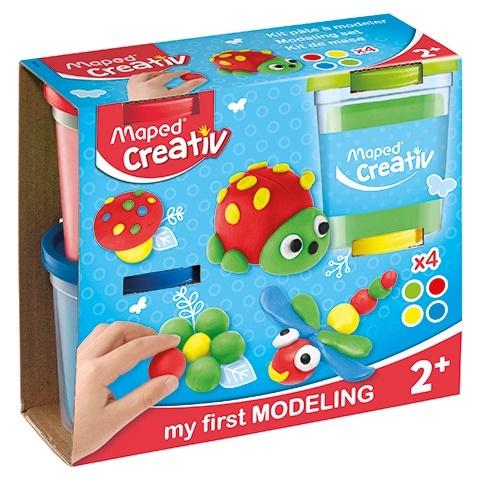 Opakowanie o wymiarach 15,5 x 17 x 7 cm. Zestaw zawiera 4 pudełeczka z modeliną w różnych kolorach. Dla dzieci od 2 roku życia.
