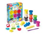 Miękka, nieklejąca się masa plastyczna w 9 kolorach: biały, żółty, czarny, pomarańczowy, różowy, czerwony, zielony i fioletowy. W zestawie akcesoria uatrakcyjniające zabawę: wałek, nożyk, 2 wyciskarki, 8 kształtów do odciskania. Praca z masą rozwija zdolności manualne dzieci. Ćwiczenie mięśni małych rączek jest ważnym etapem przygotowującym najmłodszych do nauki pisania. Transparentne pojemniki o pojemności 56 g umożliwiają podgląd zawartości bez otwierania.