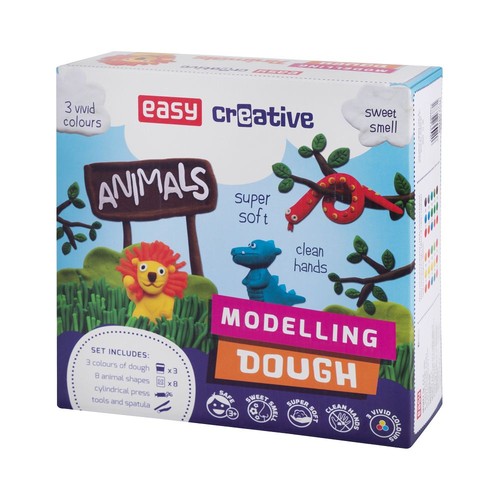 Zestaw kreatywny, masa plastyczna: Animals przyniesie Twojemu dziecku mnóstwo radości i satysfakcji z możliwości budowania własnego, kolorowego świata. Pokaż swojemu dziecku niezwykły, kolorowy świat. Zabawa masą plastyczną pomaga rozwijać wyobraźnię, lepienie modeli pomaga kształtować postrzeganie figur trójwymiarowych, rozwija również zdolności manualne. Zestaw kreatywny, masa plastyczna Ciastokreacja ma przyjemną konsystencję, która ułatwia dzieciom tworzenie własnych konstrukcji. Zestaw kreatywny, masa plastyczna: Animals W zestawie trzy małe (56g) kubki masy plastycznej z foremkami, 8 foremek w kształcie zwierzątek, nożyk oraz szpatułki