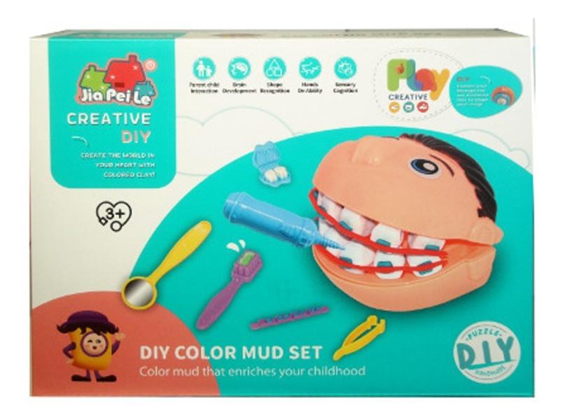 Zestaw masy plastycznej do wykonywania zabiegów dentystycznych. W zestawie m.in.: głowa człowieka, forma do tworzenia zębów z masy, lusterko, nóż oraz 5 kolorów masy plastycznej. Po zakończonej zabawie masę plastyczną należy chować do kubeczków, aby uniknąć jej wyschnięcia (a dalej kruszenia). Produkt przeznaczony dla dzieci od 3 lat. . Zabawka zapakowana w kartonowe opakowanie.