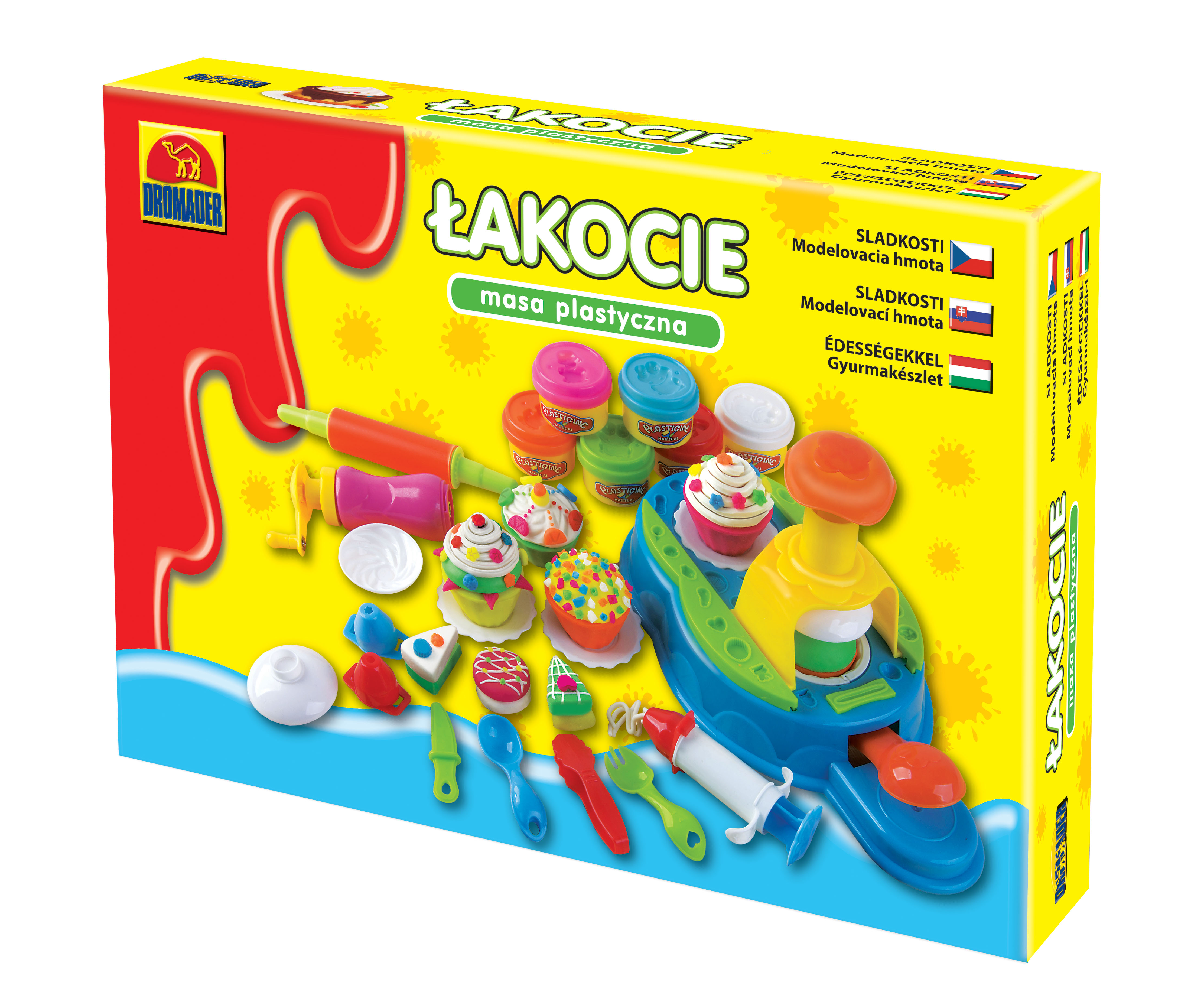 Zestaw masy plastycznej z foremkami i akcesoriami do tworzenia kolorowych ciast, babeczek i słodkości.