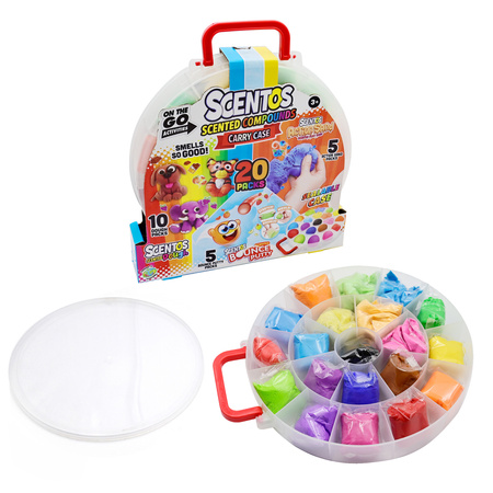 - zestaw zawiera 20 zapachowych mas plastycznych: ciastolinę w 10 kolorach, odbijającą się ciastolinę w 5 kolorach i piasek kinetyczny w 5 kolorach; całość zapakowana w praktyczną walizkę;