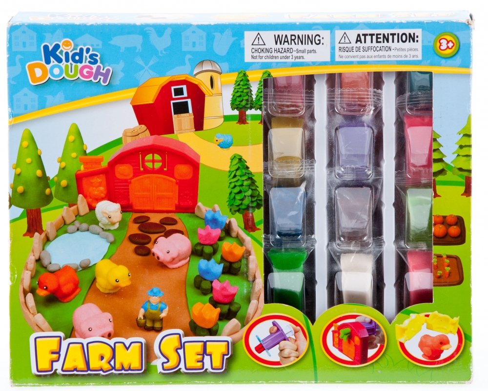 W zestawie znajdują się 12 sztuk masy plastyczne w 12 kolorach, foremki oraz narzędzia do wykrawania postaci zwierzątek.