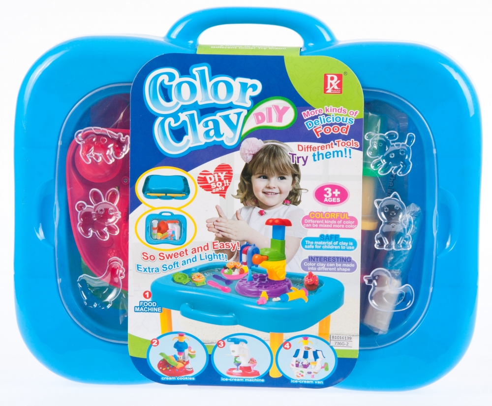 Zawartość zestawu stolik w formie walizki, 4 x pudełeczka z masą plastyczną, dodatkowe kolory masy w woreczku, maszynka do robienia deserów, foremki, nożyczki do cięcia masy, wałek.