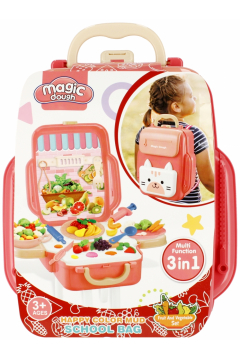 Zawartość zestawu: 2x talerzyk, wałek, warzywa, owoce, nożyk, sztućce, 10 kolorów mas plastycznych, szelki, podstawka z formą do masy. Zestaw wykonany z plastiku oraz masy.