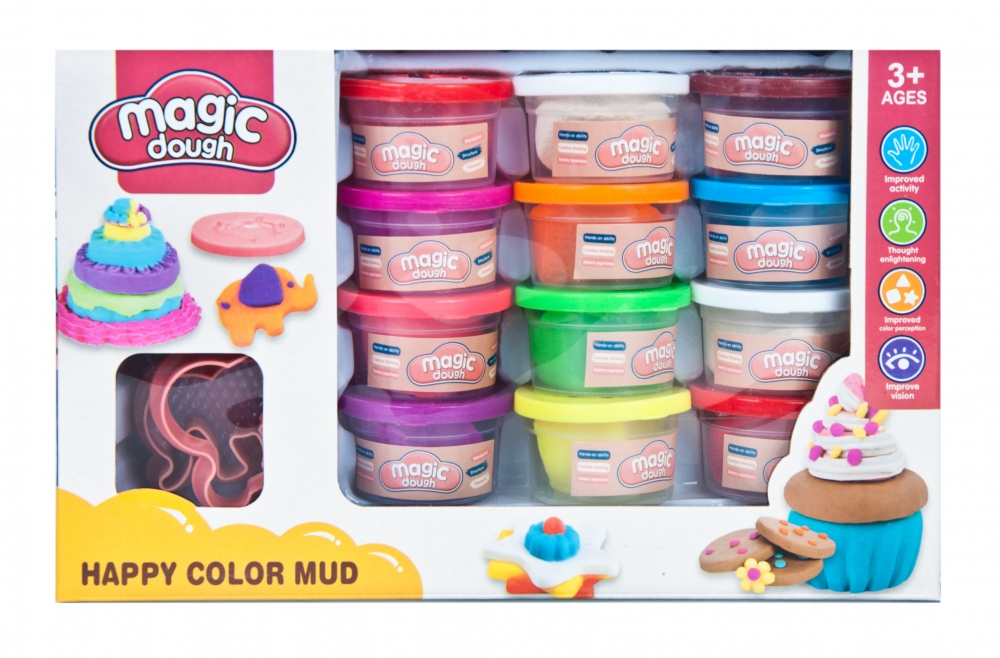 Zawartość zestawu: 12 mas plastycznych, foremki do wykrawania.