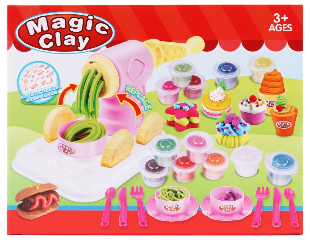 Zawartość zestawu: 12 mas plastycznych, foremki do wykrawania, maszynka, talerzyki i sztućce.