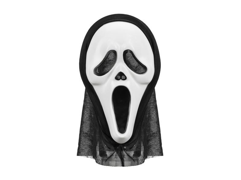 Maska z kapturem Halloween w kolorze biało-czarnym, wymiary maski ok. 18 x 31 cm, długość kaptura ok. 38 cm.