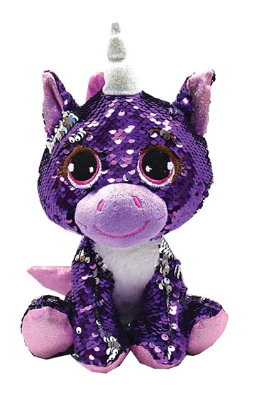 Piękny, fioletowy jednorożec z chęcią pobawi się z Tobą. Jest mięciutki, pokryty dwustronnymi cekinami. Cekiny są fioletowe, natomiast od spodu srebrne. Uszka i nóżki są wykończone mieniącym się materiałem. Brzuszek wykonany jest z mięciutkiego, białego pluszu o krótkim włosiu. Zabawka przeznaczona dla dzieci powyżej trzeciego roku życia.