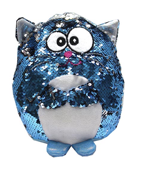 Przygarnij uroczego kotka! Kotek pokryty jest dwustronnymi cekinami w kolorze turkusowym od góry i srebrnymi od dołu. Łapki ma złożone razem na brzuszku, dzięki czemu może w nich coś trzymać. Uszka i nóżki są wykończone mieniącym się materiałem. Brzuszek jak i spód kotka wykonane są z mięciutkiego pluszu o krótkim włosiu. Zabawka przeznaczona dla dzieci powyżej trzeciego roku życia.