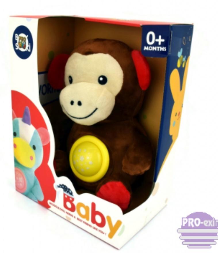 Maskotka grająca Małpka jest idealnym towarzyszem dla dziecka podczas zasypiania. Spełnia funkcję pluszaka, pozytywki i lampki w jednym. Po włączeniu pozytywki wyświetla na suficie lub ścianie gwiazdki. Dodatkowo z głośnika leci spokojna kołysanka, dzięki temu dziecko nie boi się ciemności i łatwiej zasypia.