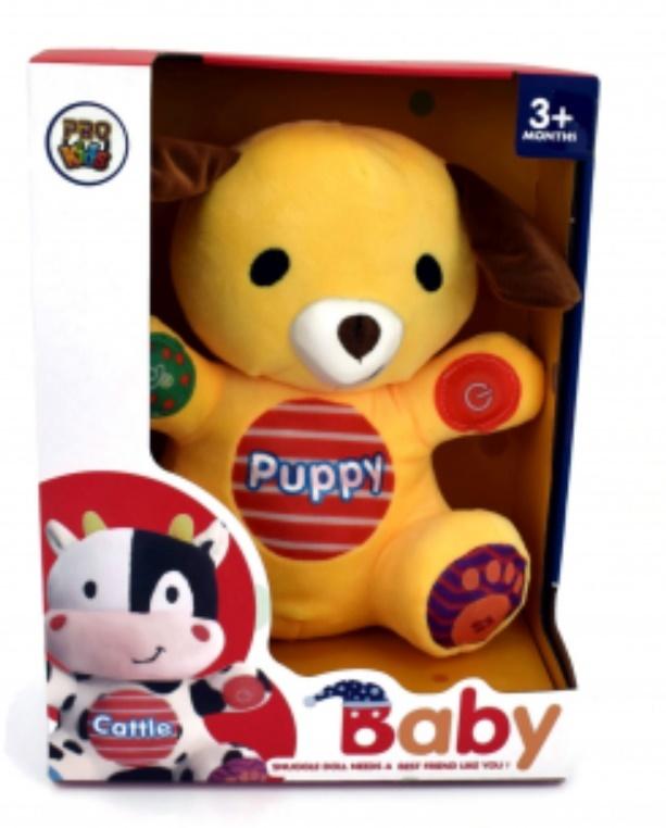 Maskotka grająca Piesek B/O /36 to pluszak z zabawnymi dźwiękami. Włączniki umieszczone są na 4 łapkach, a po naciśnięciu wydobywa się z głośnika śmiech dziecka, zabawn odgłosy lub kołysanka.