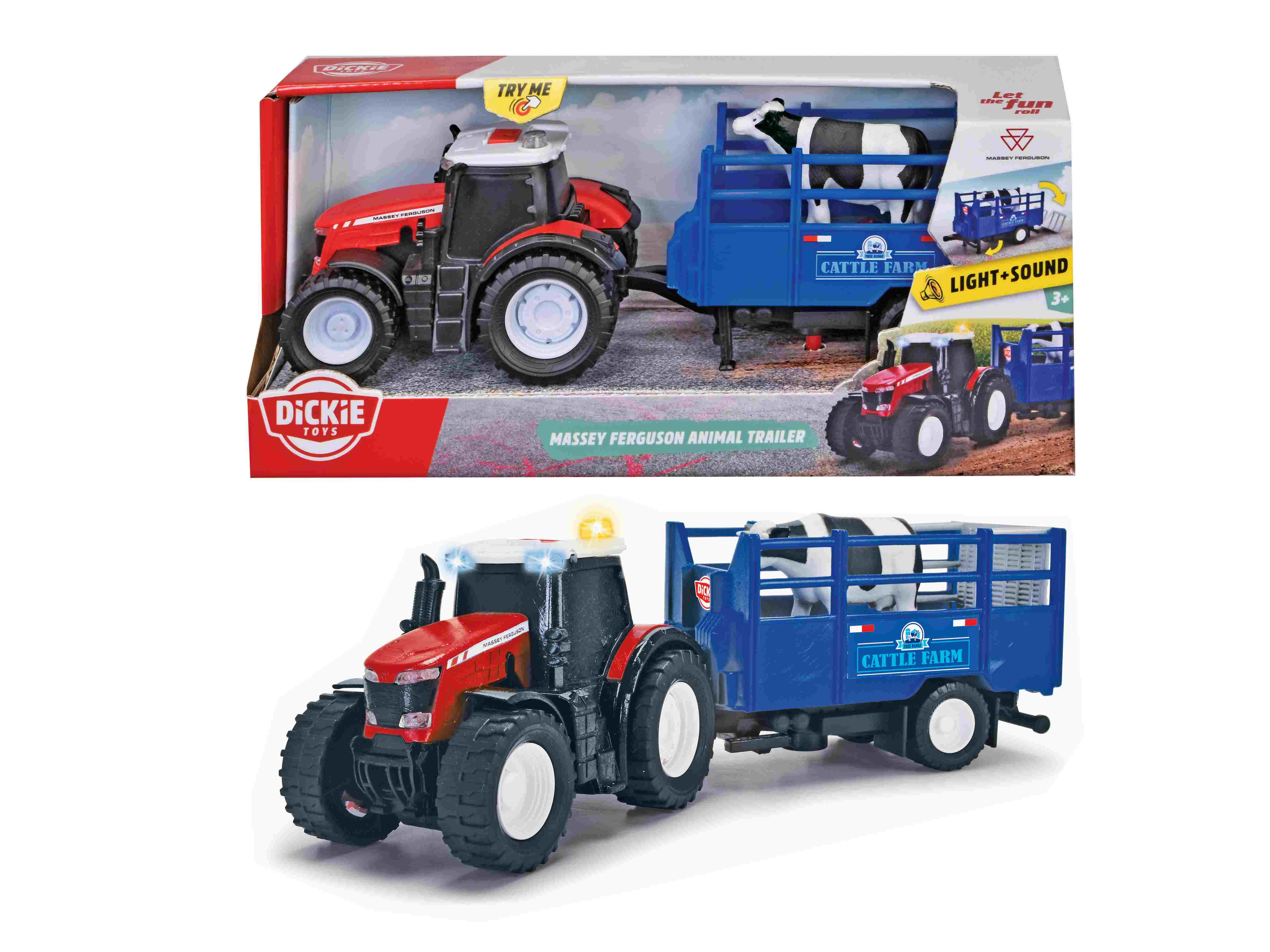 Traktor na licencji Massey Ferguson z funkcją światłą i dźwięku. W zestawie znajduje się odczepiana przyczepka do transportu zwierząt z figurką krówki. Długość 26 cm.