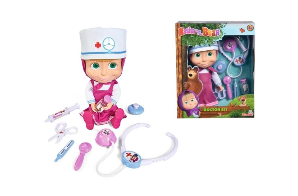 Dziecko za pomocą realistycznych lekarskich akcesoriów może zbadać i leczyć Maszę. Zestaw małego lekarza zawiera między innymi: lalkę Maszy, stetoskop wydajacy dźwięki, termometr, strzykawkę, nożyczki oraz wiele innych co daje łącznie 7 elementów.