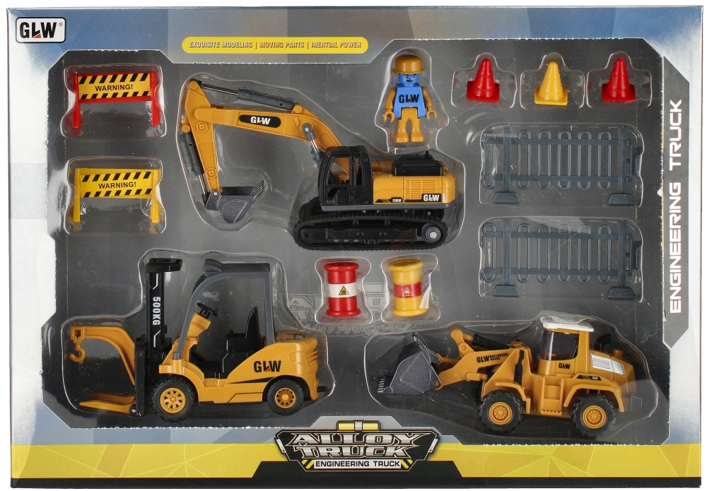 Zawartość zestawu  3x maszyna budowlana, 1x figurka robotnik, akcesoria budowlane. Całość wykonana z metalu, gumy i plastiku Wymiary/waga/baterie  Wymiary produktu  dł. wys. gł.  cm  wózek widłowy 13x8x5. Waga produktu bez opakowania  kg.  0,35 kg, Wymiary opakowania produktu  dł. x wys. x gł.   cm  34x24x7.