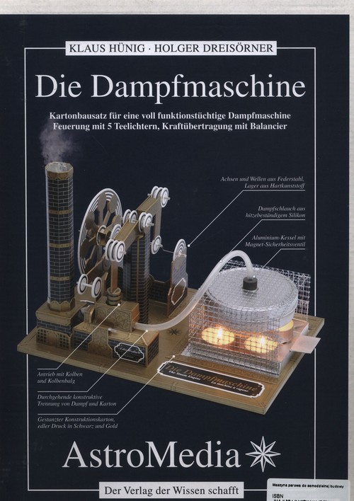 Jak działa maszyna parowa: Czy wiesz, że napęd parowy nie powstał wraz z wynalazkiem Watta? Za pierwszy silnik parowy uchodzi Bania Herona z I w n.e. (również w zestawach AstroMedia), potem należy wspomnieć o pracach Thomasa Newcomena, Thomasa Savery i innych. Spalając pod napełnionym kotłem drewno bądź węgiel, doprowadzano wodę do wrzenia. Wytworzona w ten sposób para była doprowadzana przez układ rozrządu do cylindra. Tłok wprawiany był w ruch poprzez naprzemienne wpuszczanie będącej pod wysokim ciśnieniem pary do przedniej i tylnej części cylindra (rozdzielonych tłokiem). Następnie za pośrednictwem korbowodu przenoszono wytworzoną energię na wał korbowy i koło zamachowe. W celu stabilizacji obrotów w maszynach parowych używany był regulator odśrodkowy. Opis: Model maszyny parowej, to idealny pomysł na prezent dla każdego fana modelarstwa. Będzie to świetna zabawa nie tylko dla dzieci, ale i dla dorosłych. Zestaw, dzięki któremu zbudujesz prawdziwą działającą maszynę parową z kartonu! Para jest wytwarzana w aluminiowym kotle ogrzewanym pięcioma świeczkami „tealight”, a wszystko jest bezpiecznie zamknięte w drucianej kotłowni. System pary jest oddzielony od kartonowej konstrukcji co zapewnia jej trwałość, a kluczowe elementy są dodatkowo osłonięte aluminiową folią. Model silnika parowego, który znają Państwo w naszej ofercie, to przede wszystkim elementy, które dopracowane są w każdym najmniejszym szczególe. Zależy nam na Waszym zadowoleniu, dlatego jakość wykonania modelu jest na najwyższym poziomie. Sztancowany karton pozwala na wyjęcie elementów bez wycinania. Gotowy silnik może poruszać np. karuzelę (do nabycia jako osobny zestaw) przez prawie godzinę. Maszyna parowa - model, który prezentujemy to doskonały pomysł na spędzenie wolnego czasu. Składanie maszyny pozwoli się wyciszyć, skupić, a także da dużo satysfakcji z wykonanego zadania. Zapraszamy do zakupu! Wymiary po złożeniu: około 300 mm x 210 mm x 210 mm Zawartość zestawu: 2 sztancowane arkusze tektury 0,5 mm 4 sztancowane arkusze tektury 0,4 mm 2 drukowane, niesztancowane arkusze tektury 1 twarda płyta 6 x 210 x 297 mm 1 arkusz aluminium 0,18 mm 1 aluminiowa puszka z przykręcaną pokrywą 1 ocynkowana siatka druciana, 220x330mm 5 części ze stali fi 1,5 mm: wał korbowy, uchwyt zaworu, oś 40 mm, 2 osie 27 mm 15 dysków d1,5 x D15 mm z 1 mm PVC 1 rura silikonowa d0.8 x D2.8 x 110 mm, 1 rura silikonowa d5 x D7 x 275 mm 1 plastikowa rękawica, 3 patyczki higieniczne, 2 strzykawki 2 ml i 10 ml 1 magnes d6 x D15 x H10mm, 1 piankowa uszczelka 2,5 cm, 1 ocynkowana podkładka, d8.4 x D16 mm, 2 x 2 pierścienie O-ring D6.5 mm i D8.5 mm 1 szablon kotłowni, 1 szablon dla blachy aluminiowej polskojęzyczna instrukcja