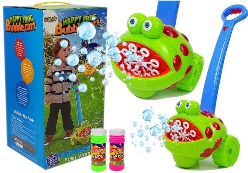 Maszynka Do Baniek Mydlanych Żaba z Niebieską Rączka Muzyka Światła Dlaczego warto wybrać taką maszynę? Ponieważ w czasie, w którym człowiek przy użyciu klasycznego zestawu jest w stanie zrobić tylko jedną bańkę, maszyna może zrobić ich setki. Pozwoli przenieść się dziecku w magiczny świat. Robienie baniek mydlanych z użyciem prezentowanej maszyny jest bardzo prostym zajęciem. Po naciśnięciu na rączce przycisku Twój maluch usłyszy wesołą muzyczkę i odgłosy puszczania baniek. Niebieska rączka ma długość 36 cm, dzięki czemu maluch będzie mógł swobodnie prowadzić żabkę. Urozmaici każdy spacer i zabawę w ogrodzie. Pomoże dobrze rozwijać się Twojemu dziecku poprzez dotyk i słuch. Zabawa dająca radość i duże efekty w rozwoju Twojego dziecka. Elementy zestawu: - żabka z rączką - 2x płyn do baniek mydlanych Wymiary żabki: 18 cm x 19,5 cm x 47,5 cm Wysokość rączki: 36 cm Wymiary pudełka: 39 cm x 19,5 cm x 19 cm Żabka zasilana jest trzema bateriami AA 1.5V (brak w zestawie). Zabawka przeznaczona jest dla dzieci powyżej 3. roku życia. Zestaw posiada certyfikat CE i jest zgodny z normą EN 71. Zestaw zapakowany jest w kartonowe pudełko, dzięki czemu nadaje się idealnie na prezent.