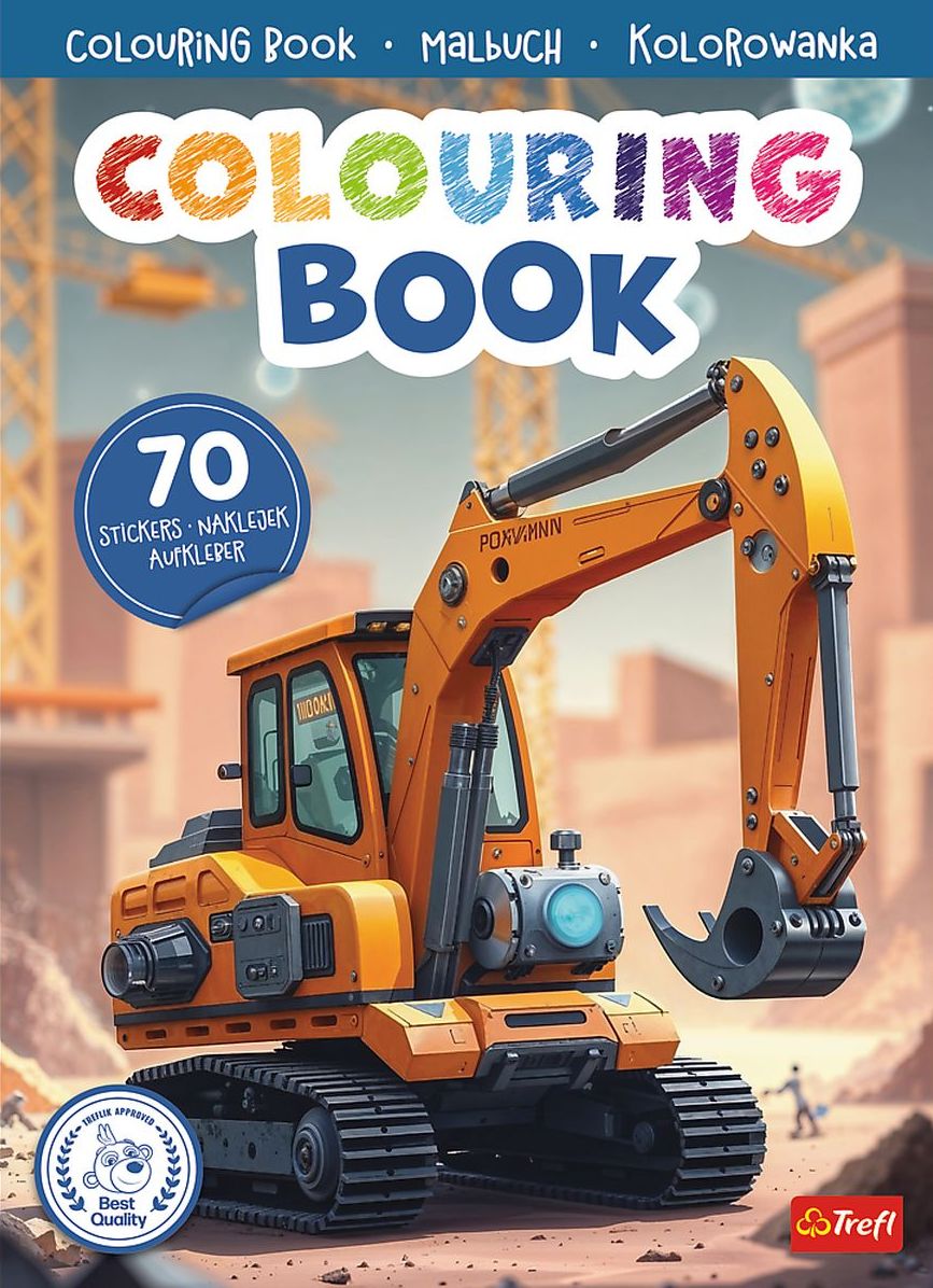 16-stronicowa kolorowanka z maszynami budowlanymi. W środku aż 70 naklejek.
