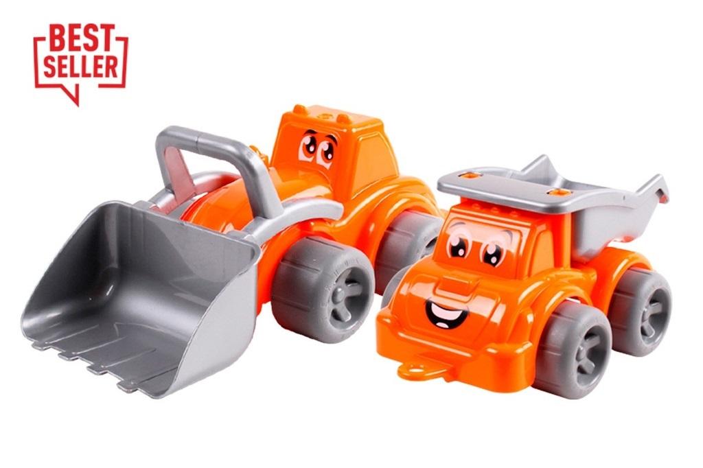 Zestaw dwóch maszyn - wywrotki i traktora. Wszystko, czego potrzebujesz, aby zacząć budować w piaskownicy.