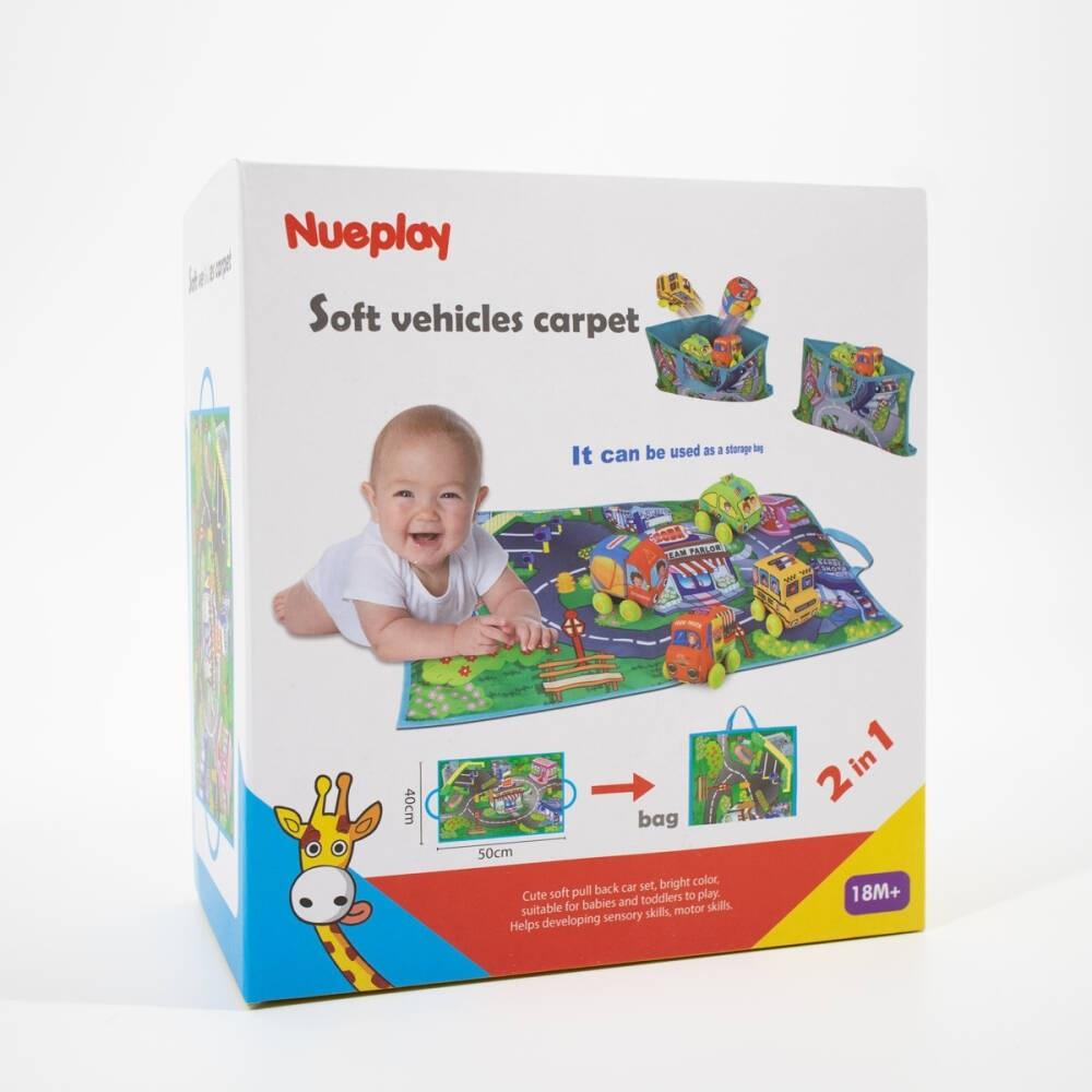 Mata 2w1 dla dziecka z 4 autkami, która przeznaczona jest do zabawy i może posłużyć jako poręczna torba. Mata jest dla dzieci od 18 miesiąca życia