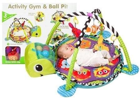 Mata Edukacyjna Dla Maluszka Żółw 3w1 Basen Piłki Mięciutka mata wykonana z przyjemnego w dotyku materiału, posiada atrakcyjne żywe kolory, które przyciągną uwagę najbardziej niespokojnego niemowlaka. Kształtuje ona wyobraźnię dziecka, uczy rozróżniania kształtów i kolorów oraz rozwija zmysły: dotyku i wzroku. Dba o rozwój maluszka już od pierwszego dnia życia. Zaprojektowana jest w sposób umożliwiający korzystanie z niej na różne sposoby - maluch może bawić się na niej, leżąc na brzuszku bądź na pleckach, a także siedząc. Do produktu dołączone jest 30 kulek w różnych kolorach, które możemy wsypać do basenu i zapewnić niezapomnianą zabawę. Następnie wszystkie piłki można schować w głowie żółwia i zmienić zabawę z basenu na matę. W zestawie zawarte są 4 różne morskie zabawki, które można zawiesić na pałąkach. Przyciągną jego uwagę i będzie chciał poznawać ich strukturę i wygląd. Matę można rozkładać na 3 sposoby: 1.Wielofunkcyjna mata z 2 pałąkami i wiszącymi zabawkami 2.Mata zabudowana po bokach siatką, zabezpieczy przed wydostaniem się dziecka poza obszar zabawy 3.Basen z piłkami-prawdziwa frajda dla maluszka ! Wymiary opakowania: 61 x 52 x 11 cm Mata zapakowana w kolorowe pudełko idealnie nadaje się na prezent. Przeznaczona dla dzieci już od pierwszych dni życia. Zgodna z normą EN71 i całkowicie bezpieczna dla dziecka.