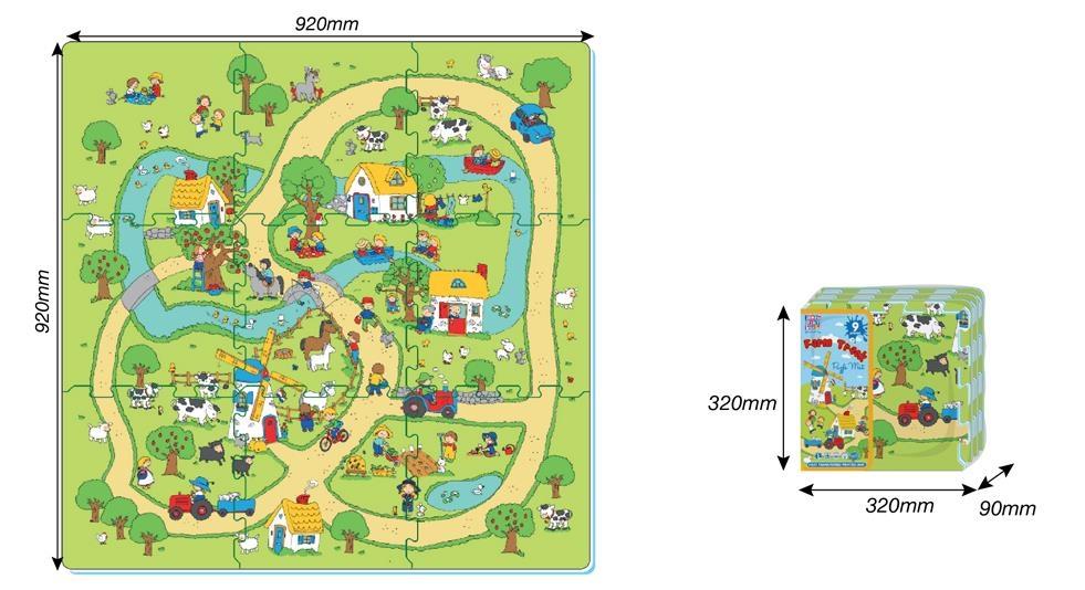 Puzzle edukacyjne z motywem farmy wykonane są z miękkiej i miłej w dotyku pianki. Dzięki zastosowaniu specjalnej techniki nadruku termotransferowego kolory puzzli są wyjątkowo intensywne i trwałe. Zabawa nimi pomaga rozwijać u najmłodszych wyobraźnię przestrzenną oraz uczy koncentracji i cierpliwości. Puzzle można łączyć ze sobą tworząc matę podłogową. Puzzle z motywem farmy wprowadzą malucha w świat zwierząt domowych i pomogą w nauce ich nazw. Zawartość: 9 puzzli z motywem farmy