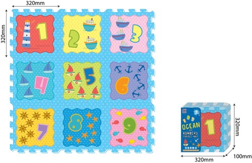 Puzzle edukacyjne z cyferkami wykonane są z miękkiej i miłej w dotyku pianki. Dzięki zastosowaniu specjalnej techniki nadruku termotransferowego kolory puzzli są wyjątkowo intensywne i trwałe. Zabawa nimi pomaga rozwijać u najmłodszych wyobraźnię przestrzenną oraz uczy koncentracji i cierpliwości. Puzzle można łączyć ze sobą tworząc matę podłogową. Układanka będzie niewątpliwą pomocą w nauce cyfr. Zawartość: 9 puzzli z motywem oceanu i cyferkami