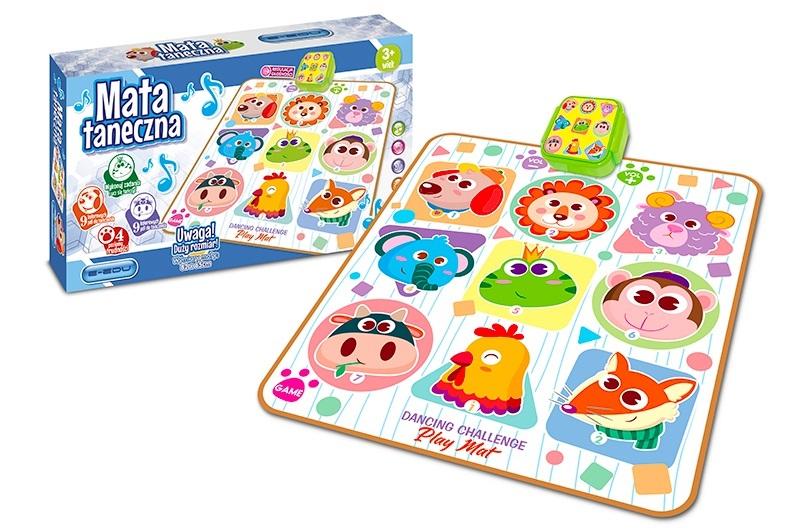 Funkcje: 9 pól z sensorami nacisku, podświetlany moduł dźwiękowy, 3 tryby zabawy: tryb 1-3 o rosnącym poziomie trudności, im wyższy tryb tym więcej pól do naciśnięcia , tryb 4 należy naciskać wskazane pola na macie, by muzyka grała dalej, tryb 5 pianinko, po naciśnięciu pól słychać dźwięk klasycznego pianinka w gamie c-dur, regulacja głośności, wym. Maty po rozłożeniu: 82 x 65 cm., Wym. Opk: 40,5 x 23 x 7,5 cm., Baterie: 3 x aa 1,5v brak w zestawie, 3+