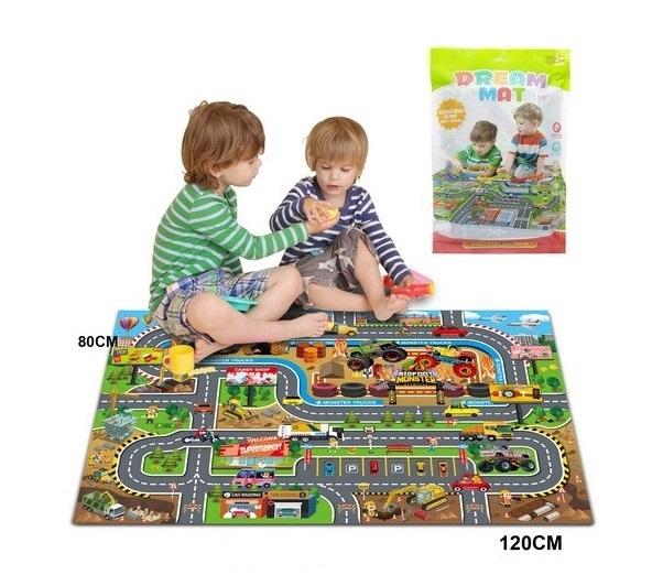 Filcowa mata do zabawy przedstawiająca plac budowy i tor motocrossowy. Dzieci mogą jeździć po niej samochodami, a także dodawać inne elementy dla urozmaicenia zabawy. Wymiary maty po rozłożeniu to 1.2 m x 0.8 m. Produkt zapakowany w kolorowy worek. Podane wymiary są wymiarami opakowania. Produkt dla dzieci od 3 lat.