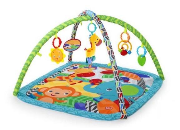 Mata aktywizująca Wesołe Zwierzątka. Zawiera: pluszową żyrafkę, grającą 4 urocze melodyjki, bezpieczne dla maluchów lustereczko, grzechotki w kształcie słoneczka i kółka, 4 zawieszki na dodatkowe zabawki oraz kolorową, łatwo spieralną i wygodną dla maluszków matę.