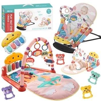 Zestaw gimnastyczny 2w1mata do leżenia, kołyskanMata z kołyską 2w1 to wyjątkowy produkt, który dostarcza zarówno rozrywki, jak i komfortu maluszkowi. Ta miękka mata została zaprojektowana, by zaspokajać różnorodne potrzeby niemowląt, zapewniając im godziny fascynującej zabawy i relaksu.nMata jest nie tylko wygodnym miejscem do położenia dziecka, ale również prawdziwym źródłem rozrywki. Na specjalnej obręczy umieszczone są kolorowe zawieszki. Dziecko może bezpiecznie chwytać i bawić się nimi, co pomaga w rozwijaniu zdolności motorycznych i zmysłu dotyku.nDodatkowo, matę wyposażono w specjalne klawisze (pianinko) umieszczone w zasięgu stópek malucha. Po ich dotknięciu wydają one różnorodne dźwięki, co dostarcza maluchowi nie tylko rozrywki, ale także stymuluje jego słuch i koordynację ruchową. Światło LED przyciągnie uwagę dziecka i dodatkowo urozmaici zabawę. Będzie również mogło one posłużyć jako światło podczas drzemki u malucha.nTo jednak nie koniec możliwości tej maty! W szybki i łatwy sposób można ją zamienić w kołyskę, co stanowi dodatkowy element komfortu dla maluszka. Kołyszący ruch może pomóc dziecku zrelaksować się i zasnąć, co jest niezwykle cenne zarówno dla niemowląt, jak i dla rodziców.nTa wielofunkcyjna mata z kołyską to nie tylko doskonałe miejsce do zabawy, ale również sposób na stymulowanie rozwoju sensorycznego, motorycznego i emocjonalnego dziecka. Dzięki niej maluszek może bezpiecznie i komfortowo eksplorować świat, rozwijając swoje umiejętności w przyjemny sposób. Wybierając tę matę, dbasz o rozwój i dobre samopoczucie swojego dziecka, dając mu jednocześnie możliwość fascynującej zabawy i relaksu.nW zestawie znajduje się:nmata do leżenia z możliwością zmiany w kołyskęnpianinkonzawieszkinWymiary opakowania: 90 x 13 x 40 cm