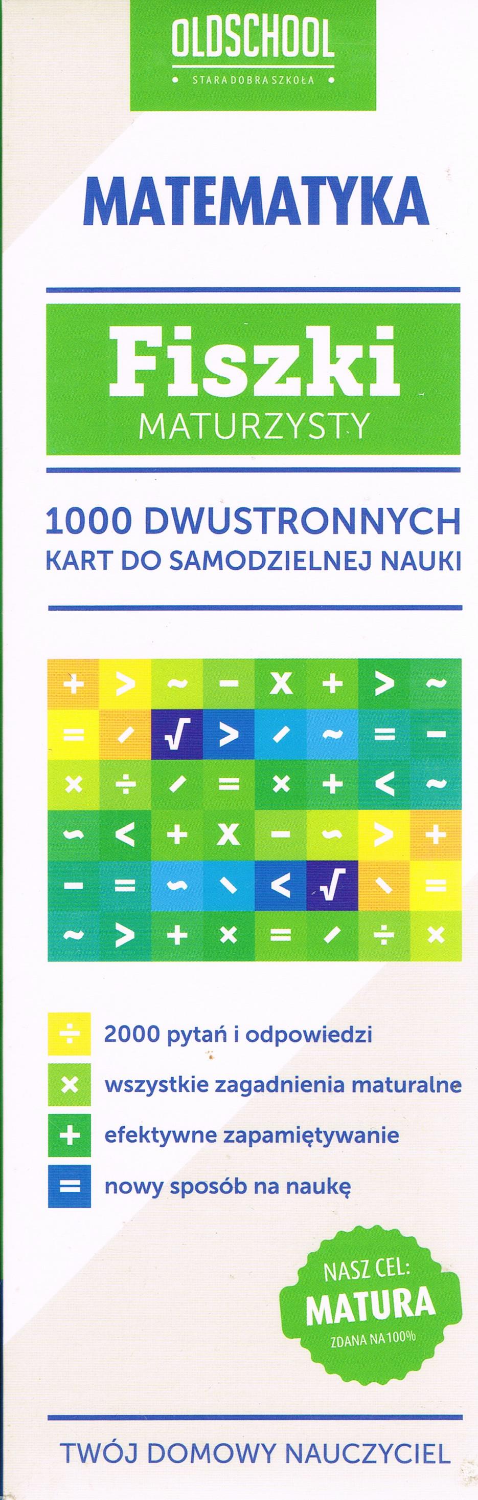 Potrzebujesz korepetycji z matematyki? Powtórki przed maturą? Szybkiej pomocy przed klasówką? Nowa seria repetytoriów dla licealistów „OLDSCHOOL – stara dobra szkoła” to skuteczna nauka tego, czego naprawdę potrzebujesz. Seria „OLDSCHOOL – stara dobra szkoła” została przygotowana przez doświadczonych korepetytorów i metodyków, a wszystkie publikacje są konsultowane z nauczycielami i samymi maturzystami. „Fiszki maturzysty” to skuteczna nauka tego, czego naprawdę potrzebujesz. Skorzystaj z nowego sposobu na szybkie zapamiętywanie! Weź to na rozum! My w Ciebie wierzymy! Seria „OLDSCHOOL – stara dobra szkoła” została przygotowana przez doświadczonych korepetytorów i metodyków, a wszystkie publikacje są konsultowane z nauczycielami i samymi maturzystami. „Fiszki maturzysty” to skuteczna nauka tego, czego naprawdę potrzebujesz. Skorzystaj z nowego sposobu na szybkie zapamiętywanie! Weź to na rozum! My w Ciebie wierzymy! „Fiszki maturzysty” to: – 1000 dwustronnych kart do samodzielnej nauki – 2000 pytań i odpowiedzi – wszystkie zagadnienia maturalne – efektywne zapamiętywanie – nowy sposób na naukę Dzięki „Fiszkom maturzysty”: – opanujesz wszystkie zagadnienia wymagane na maturze na poziomie podstawowym: wzory, wykresy, przykłady rozwiązań zadań, definicje – sprawdzisz i usystematyzujesz swoją wiedzę – dostosujesz tempo nauki do własnych potrzeb – skorzystasz z nowej, interaktywnej formy przygotowania do matury – będziesz mógł uczyć się samodzielnie lub z przyjaciółmi.