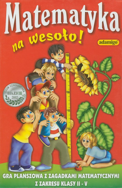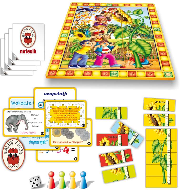 Matematyka uczy logicznego myślenia, przewidywania i zwyczajnie ułatwia codzienne życie. Dlatego zajmuję ona w hierarchii miejsce należnej „królowej nauk", choć nie każdy powie o niej - mój ulubiony przedmiot. Jak więc radzić sobie z trudnościami w opanowaniu tego przedmiotu? Oczywiście z grą "Matematyka na wesoło" Ciekawa forma gry pomaga dziecku rozwiązać pierwsze matematyczne problemy. Zestaw składa się między innymi z kolorowej planszy, 50-u kart z pytaniami i zadaniami z zakresu od II do V klasy szkoły podstawowej. Zestaw gry zawiera: 50 kolorowych kart z zagadkami matematycznymi z zakresu II-V klasy szkoły podstawowej, planszę, 4 obrazki słonecznika podzielone na 7 części, kostkę do gry, 4 pionki, 4 notesiki, oraz instrukcję do gry.