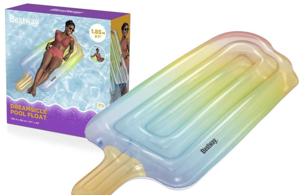 Dmuchany Materac Do Pływania Lód Na Patyku 185 x 89 cm Bestway 43161 Szukasz nietuzinkowego dodatku na plażę, do basenu, jeziora czy morza? Ten oryginalny materac dmuchany w kształcie loda na patyku to prawdziwy hit wśród akcesoriów do wypoczynku nad wodą. Dzięki barwnemu, realistycznemu nadrukowi przyciąga wzrok i wprowadza letni, radosny klimat wszędzie tam, gdzie go zabierzesz.Zaprojektowany z myślą o miłośnikach zabawy i oryginalnych form, materac wyróżnia się wyjątkowym wyglądem - przypomina apetycznego loda. Intensywne kolory i dopracowane detale graficzne sprawiają, że nie da się przejść obok niego obojętnie. Duża powierzchnia zapewnia wygodę zarówno podczas opalania, jak i leniwego dryfowania po wodzie. Dane techniczne: Wymiary: 185 x 89 cm Maksymalne obciążenie: 100 kg Materiał: PVC Grubość ścianki: 0,21 mm Komory powietrzne: 2 Kolorystyka: wielokolorowy W zestawie: - 1x materac - 1x łatka naprawcza Wymiary opakowania: 25 cm x 24 cm x 5 cm Waga opakowania: 1,1 kg