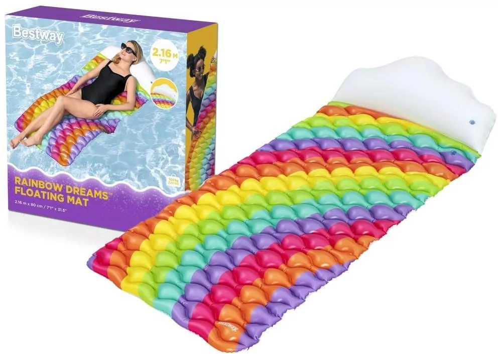 Dmuchany Materac Do Pływania Tęcza 216 x 80 cm Bestway 44107 Zapewnij sobie i swoim bliskim niezapomniane chwile relaksu na wodzie z dużym, materacem dmuchanym Bestway. Ten przestronny materac został zaprojektowany z myślą o komforcie i bezpieczeństwie, umożliwiając wspólne korzystanie z uroków lata. Wykonany z wysokiej jakości PVC, odpornego na uszkodzenia i działanie promieni UV. Wielokomorowa konstrukcja zapewniająca stabilność na wodzie. Dane techniczne: - wymiary 216 x 80 cm - materiał PVC - maksymalne obciążenie 90 kg - wbudowana poduszka - możliwość zwinięcia w rulon co ułatwia transport i przechowywanie - łatka naprawcza w zestawie Waga opakowania: 1,2 kg