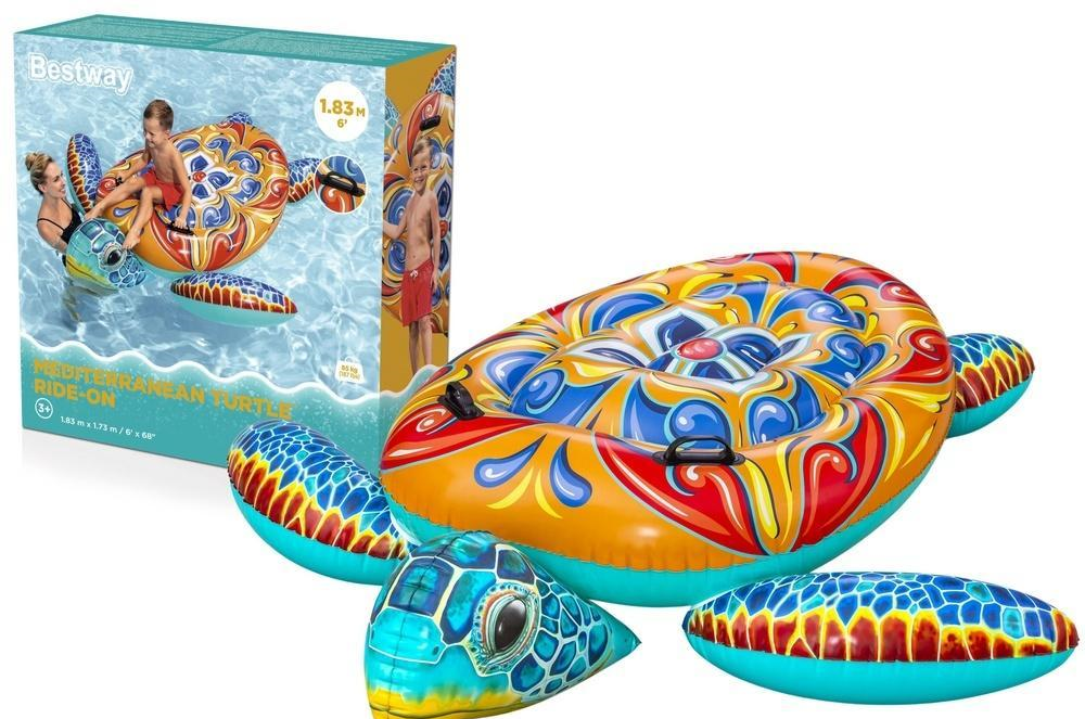 Dmuchany Materac Żółw 183 x 173 cm Bestway 41523 Przygotuj się na letnią zabawę, która zachwyci zarówno dzieci, jak i dorosłych! Dmuchany materac w kształcie żółwia od Bestway to nie tylko wygodne miejsce do relaksu, ale też efektowna atrakcja, która wyróżni Cię nad wodą. Kolorowy nadruk Majolika i realistyczna forma żółwia sprawiają, że materac przyciąga spojrzenia i zachęca do zabawy. Dzięki dwóm solidnym uchwytom i lekkiej konstrukcji, materac jest łatwy do przenoszenia i zapewnia stabilność podczas użytkowania. Idealny do plażowania, dryfowania po jeziorze czy wodnych szaleństw w basenie. Dane techniczne: - materiał PVC -maksymalne obciążenie 85 kg - uchwyty na ręce - przeznaczony dla dzieci powyżej 3 roku życia - łatka naprawcza Wymiary opakowania: 30 cm x 30 cm x 9 cm