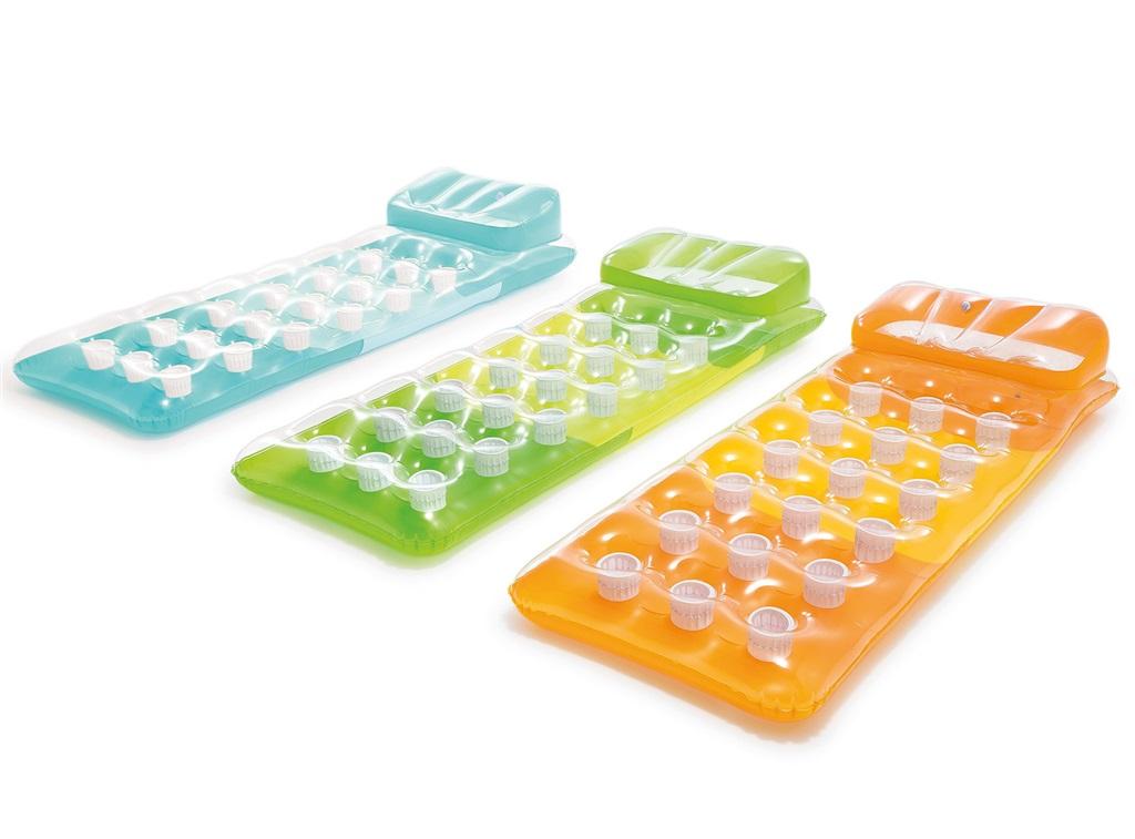 Materac z poduszką w trzech kolorach: niebieski, pomarańczowy, zielony.