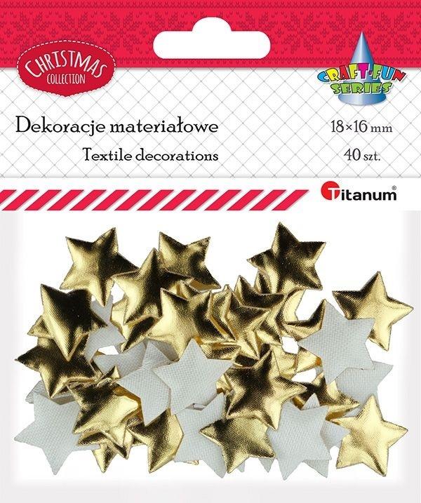 Dekoracje materiałowe. Kształt: gwiazdki, kolor: złote, wymiar: 18 mm. Opakowanie: 40 szt.